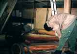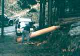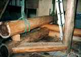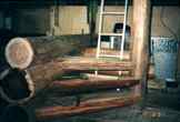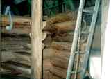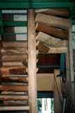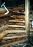 | 95年にラセン階段用の心柱を建ててから(95年山小屋内装参照)まる2年。ようやく2階へ通じるラセン階段のログを積み始めました。全部で13段。現在セトリング3センチ。 |