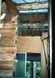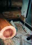 側面の壁は、ログ風にするため、丸太の切り落とし(コア)を張り付けていきます。 |