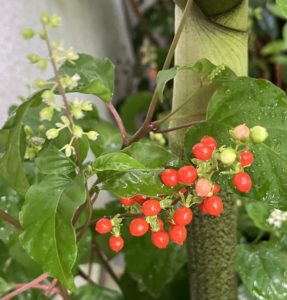 原種ハイビスカス・ロバツスの花が2輪開いた〜^^ 7・18 kao · Posted on 2023年7月18日 昨日の酷暑の後、夕方からは一気に温度が下がってくれたので少しはホッ! 朝も26度で凌ぎやすい。 「原種ハイビスカス・ロバツス」の花が2輪開いていた〜^v^ 原色の夏色!のハイビスカスの花が多い中、原種ハイビスカスの優しい淡いピンク色の花は心がほっと和むような〜〜^0ーv 検索したら結構高い価格で販売されてて、わたしゃ見切り35円でゲットしたので、ついニンマリ〜〜笑 ジュズサンゴの実がオレンジ色に色付いてきた〜^^