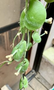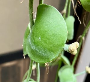 <丸い葉っぱが面白いディスキディア・インブリカータ。カンガルーポケットと同じガガイモ科のつる性植物です。つるを長くのばし、やや大きい固めの葉が内側にくるっとまいたような形になります。カンガルーポケットと少し様子が異なりますが、葉が肥大して内部が空洞になった貯水嚢(ちょすいのう)となるのが特徴です。高温多湿を好み、吊り鉢に向いています。不定期に花を咲かせます。花にはとても甘い香りがあります。耐陰性がある。>