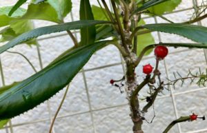 パッションフルーツの実〜^0^ 10・27 kao · Posted on 2023年10月28日 パッションフルーツの実が留守にしてる間に一回り大きくなっていた! 去年は実がつかなかったから、1個でも今年はすばらしい〜^^ さーて・・・熟してくれるかな? 百両(カラタチバナ)の実が赤くなってきた。 しかーし・・・カイガラムシの集団には参った・・・・ ここまでひどいカイガラムシ被害は初めてだ。涙 ムベは今年は4個〜〜ちょっと色づいてきたような・・・ サンザシの実は今年は”さんざん”だ。 10個もないみたい。 何が原因なんだろう?