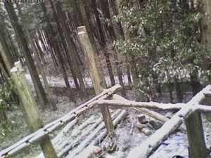雪が積もると小屋周り一面が白いベールで覆われて倒木もいろんなガラクタも見えなくなってボロ隠しになるから山小屋のモノクロ景色は好き。