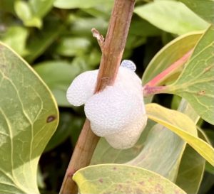 夕方、植木鉢の植物に水をやろうとしたら、白いアワアワの塊がくっついてた。