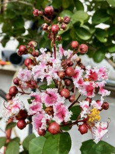 下の町中はもう百日紅の花がどこも満開なので植木鉢仕様の我が家の百日紅の蕾が遅かったのでちょっと不安だったが、開いてくれてよかった!