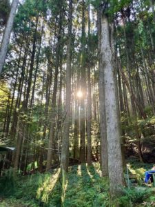 8時頃から朝日が差し込みスポットライトのように山小屋を照らす。