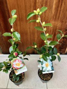 その棚にサザンカの苗木が300円で6鉢ほど残ってたので2鉢げっと。