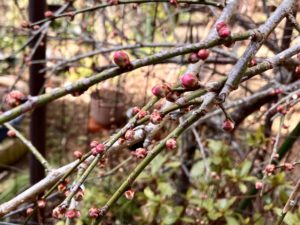 庭の白梅、紅梅の蕾が色づいてきてる。