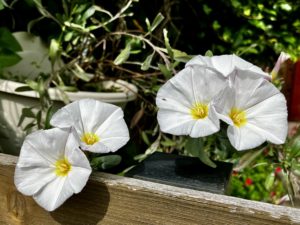 「コンボルブルス・クネオルム」&「シスタススノーホワイト」〜〜^0^ 5・19 kao · Posted on 2025年5月19日 「コンボルブルス・クネオルム」の花が今日は5輪も開いてた〜 さすが”あさがお科”だ〜白い朝顔のような花〜〜なんか懐かしく感じる。 冬の寒さも大丈夫なのが心強い。 「シスタススノーホワイト」の白い花も今花盛りだ。 ハンニチバナなのですぐ散ってしまうせいか、いっぱい蕾を持って次々と咲いてくれるので嬉しい。 挿し木で増えてくれるのがわかったので今年も挿してみるかな〜^^