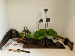 お盆飾り〜〜^0^ 8・11 kao · Posted on 2025年8月14日 この時期の”玄関飾り”は毎年ハスの実をつかって”お盆”をイメージする。 ハスの葉はツワブキの葉っぱを代用にする。 今年はアサザの葉っぱも使ってみた〜^^ 花は「エキナセア(ムラサキバレンギク(紫馬簾菊))」が一輪しか咲いてなかった。w 外は朝からずーっと雨。 この3連休はずっと雨・・・ 九州・山口は豪雨災害がでてる。
