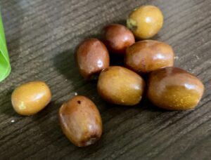 今日から11月〜〜^0^ 11・1 kao · Posted on 2025年11月6日2025年11月6日 今日から11月。 猛暑が長く続いて、ここにきてやっと秋らしくなってきた。 一昨日は夜も10度ぐらいまで冷えたが、今日は昼間16度くらいで過ごしやすい。 ヒメドラゴンフルーツの実が花は枯れたけど実が一向に太らない。 丸くなってピンク色の実になるはずなんだけど・・・・花咲いたのがおそすぎたかなぁ・・・ フェイジョアの実が落ち始めた〜〜今年は少ない。 大きさも我が家のはずっとちっこいまま。 常緑ヤマボウシの赤い実も落ち始めた〜 いただいた「ナツメ」の実〜〜^^