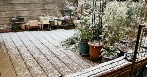 1月2日〜〜^^ kao · Posted on 2026年1月10日 2日、今朝は青空で快晴だった。 しかーし・・午後から一気に空が曇ってきて、雪が舞い始め、山の尾根がみるみる真っ白に。 3時ごろには、あれあれ〜っという間にデッキも枝垂れ梅の枝も植木鉢植物も白い雪で覆われてしまった〜〜@@ 今年初の積雪〜〜〜笑 風が強く冷たい1日。 気温は2度。