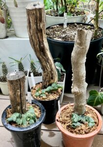 巻き置き場の樹のきれっぱしを3本持ってきて3ポットの「ラフィドフォラ」を植え替えた〜〜^^