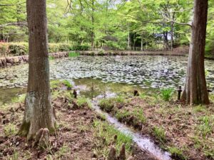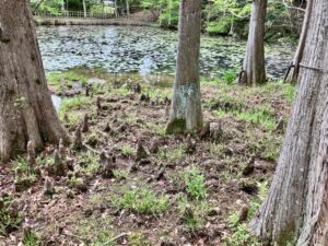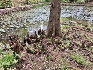 ここに来る目的は池の水蓮ではなくて池の向こう側の「ラクウショウ(落羽松)」の気根が目的。